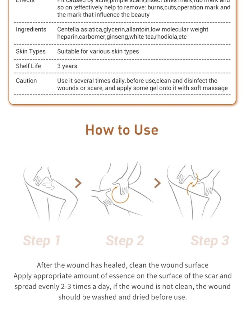 According to the size of the scar, apply a proper amount of scar gel to the affected area and gently massage until completely absorbed.